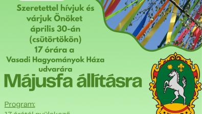 Találkozó április 30-án (csütörtökön) a Vasadi Hagyományok Háza udvarán. Innen indulunk lovaskocsikkal a májusfa kiválasztására.